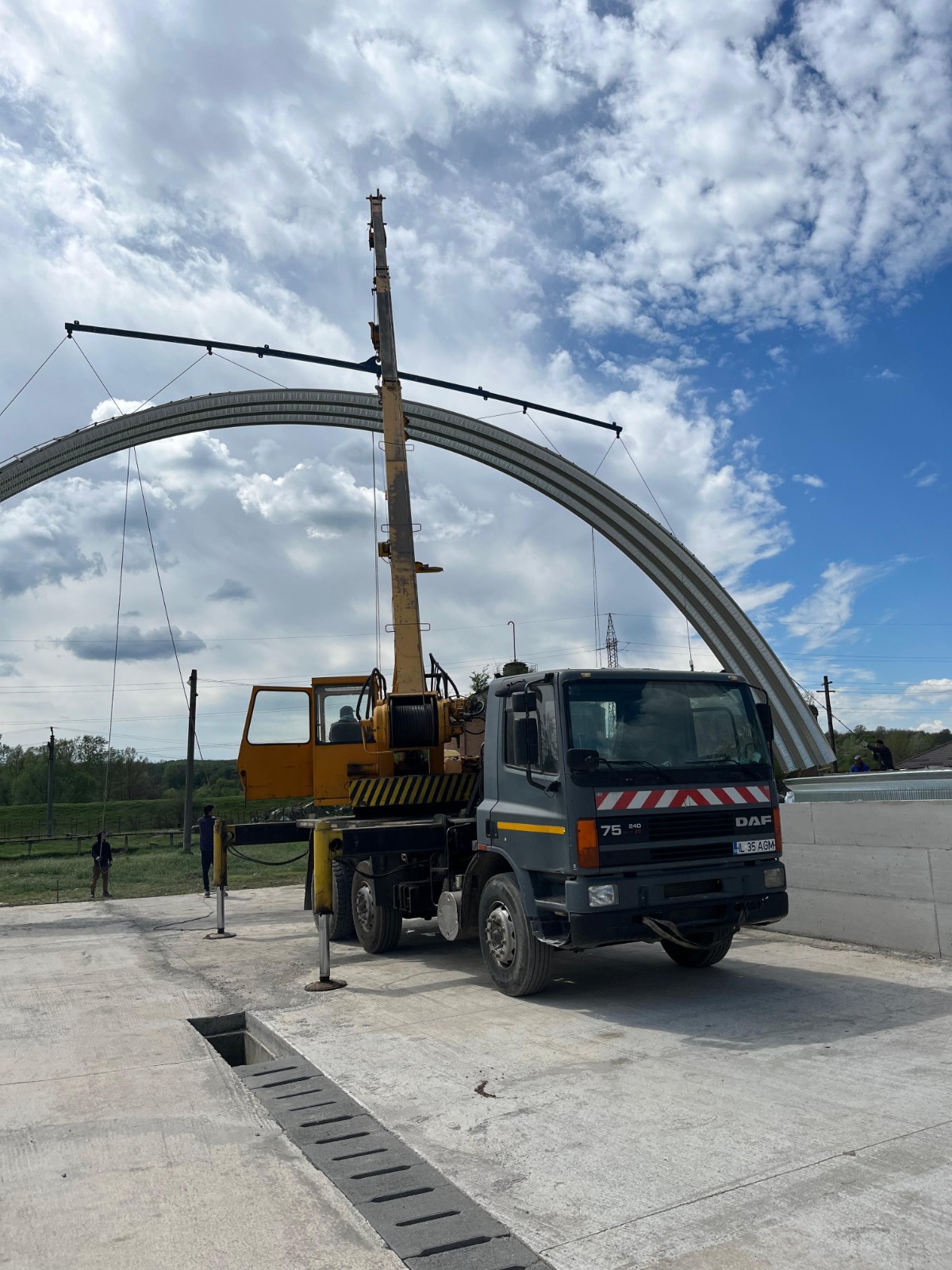 Platforma contribuie la optimizarea procesului tehnologic și la protecția mediului, asigurând condiții eficiente pentru depozitarea nămolurilor deshidratate. Construcția este realizată cu o structură metalică autoportantă, cu formă arcuită, având dimensiunile de 25,75 x 48,00 m și o înălțime maximă de 10,40 m. Structura este susținută de pereți laterali din beton armat și include un perete de compartimentare, fiind proiectată pentru funcționare eficientă și durabilă.